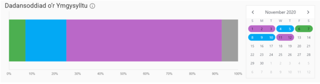 Ar waelod y Tab Ymgysylltu ar y dde mae calendr treiglol sy’n dangos pob un o’r categorïau ymgysylltu dros gyfnod o fis. Wrth y calendr, byddwch chi’n gweld y siart bar ‘Engagement Breakdown’. Amcan y bar yw dangos ichi ar sail ganrannol faint o amser rydych chi wedi’i dreulio ym mhob categori ymgysylltu ac mae’r data yn cael ei gyfyngu yn unol ag ystod y dyddiadau rydych chi’n ei ddewis ar frig y dudalen: