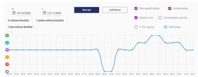 Trosolwg rhyngweithiol o’ch ymwneud â systemau’r Brifysgol yw’r graff ymgysylltu. Mae’n diweddaru ei hun i adlewyrchu ystod y dyddiadau a ddewisir ar frig y dudalen ar y chwith. Mae modd newid y graff fesul ymgysylltu dyddiol neu gyffredinol drwy glicio ar y botymau uwchben y graff: