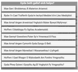 Ar frig y dudalen mae pennyn sy’n cynnwys gwybodaeth megis eich enw a’ch cwrs. Ceir nifer o ddangosyddion hefyd sy’n caniatáu ichi weld gwybodaeth allweddol mewn amrantiad.